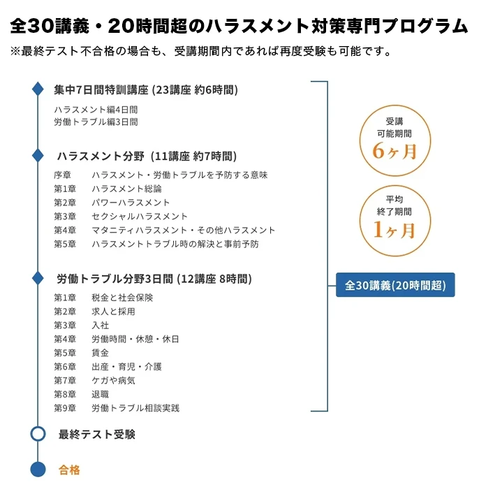 ハラスメントの未然防止や労働トラブル解決に必要な、知識と実践力を学べます。